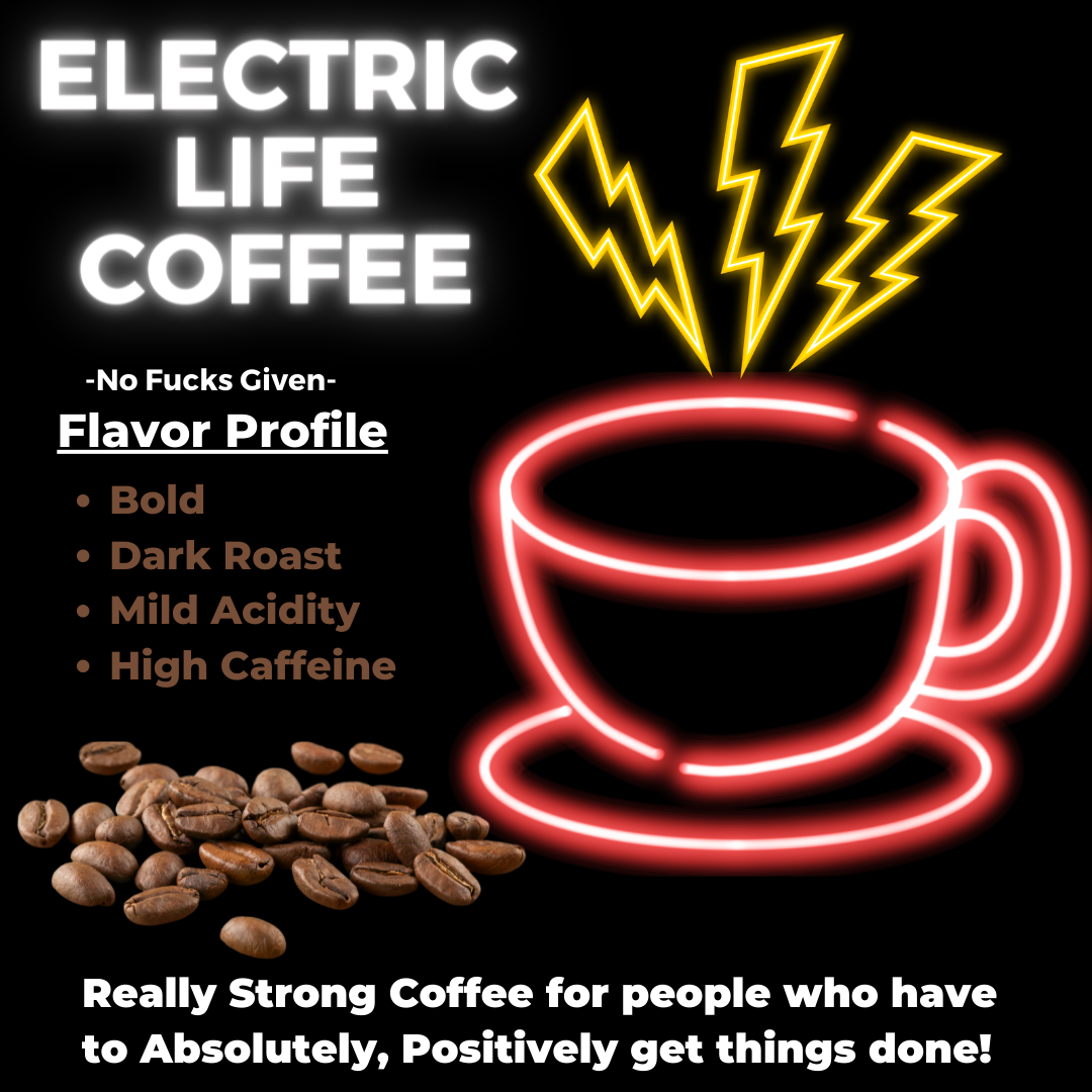 “No Fucks Given” by Electric Life: is a Bold, Dark Roast with Mild Acidity and Very High Caffeine. For about a buck a cup you can have some of the finest Rain Forrest friendly Coffee that money can buy. “No Fucks Given” shits all over Starbucks or any other major chain for a strong black coffee. I make mine with a reusable K-Cup, Single Cup Maker.